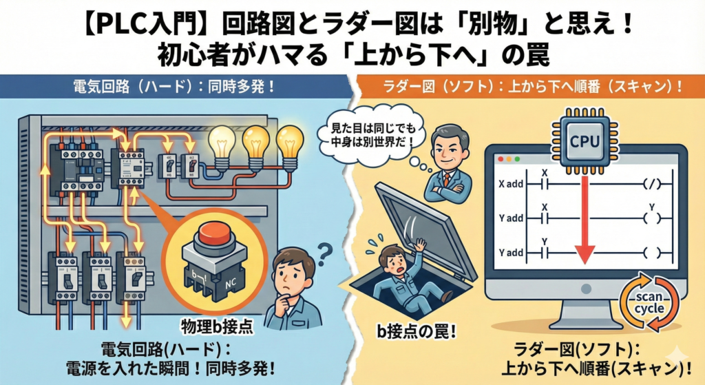 【PLC入門】回路図とラダー図は「別物」と思え!初心者がハマる「上から下へ」の罠