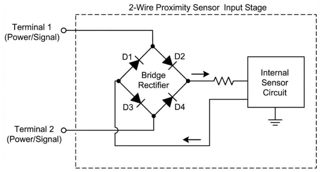 さらに、2線式センサーには「無極性」タイプもあります。 違いは入力段に「ブリッジダイオード」が入っていることです。