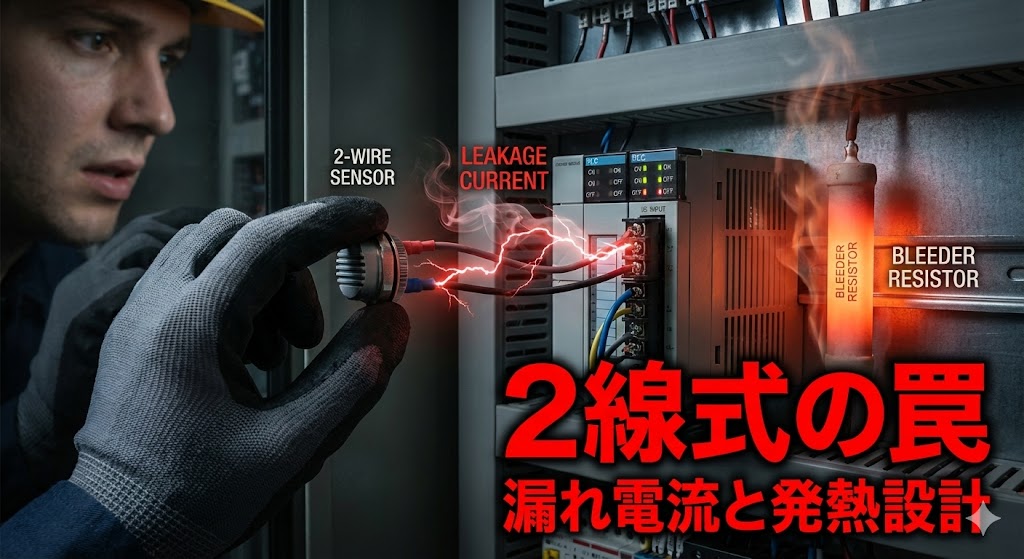 制御盤内で2線式センサーから発生する漏れ電流がPLCを誤動作させ、ブリーダー抵抗が赤熱している警告イメージ。「2線式の罠」「漏れ電流&発熱設計」という文字入り。