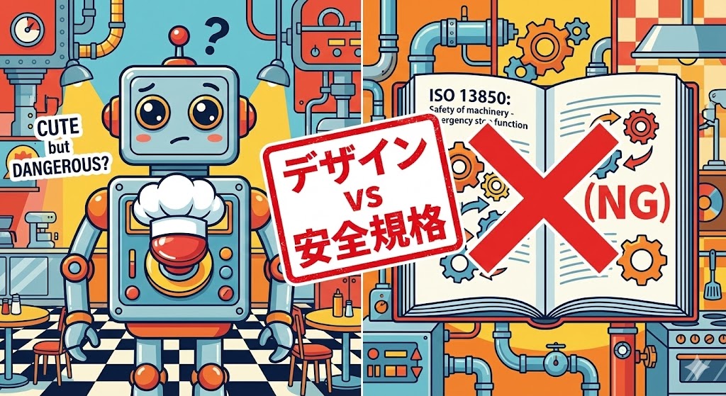 【時事ネタ】配膳ロボットの「帽子付き」非常停止はアリ?ナシ? ISO 13850から見る「ボタンカバー」の是非
