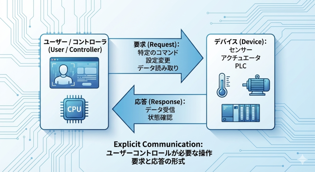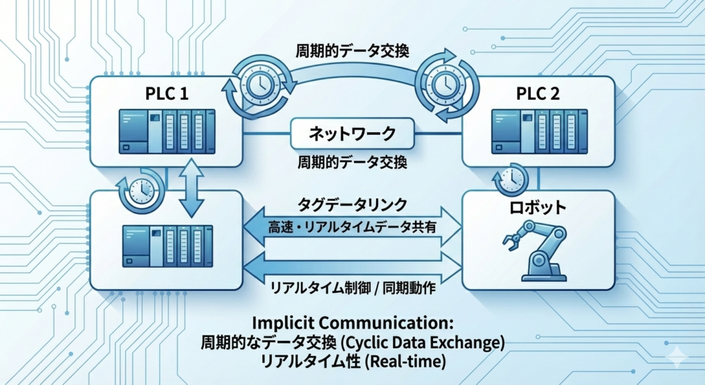 「Implicit(暗黙的な)」という名の通り、一度設定してしまえば、プログラム上で「送れ」と命令しなくても、裏で自動的に・周期的にデータを送り続ける通信です。「サイクリック通信」とも呼ばれます。