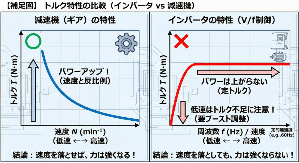 先ほどの「V/f制御」の通り、速度を下げると電圧(パワーの源)も下がってしまうからです。