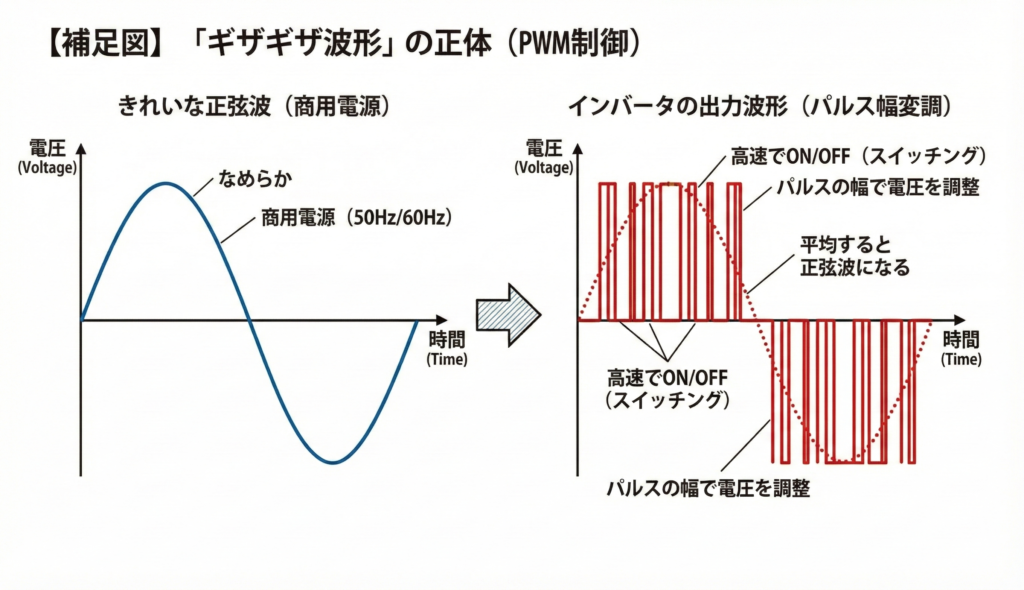 この「細切れにする(スイッチング)」ときに発生するのが、前回の記事で悪者になった「ギザギザ波形(高調波ノイズ)」の正体です。