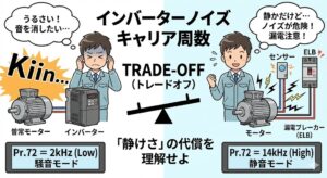 • 対策: 必ず「シールド付きケーブル」を使い、「片側接地(インバータ側だけアースに落とす)」を行ってください。