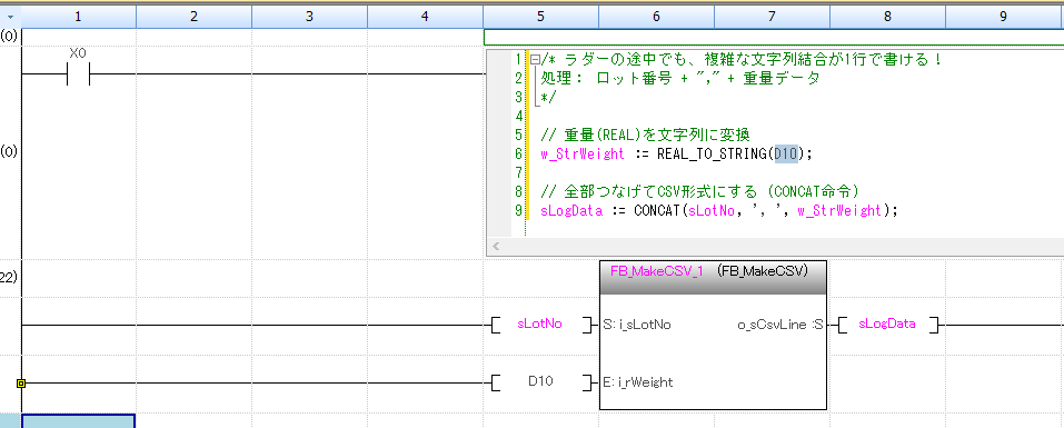 画像の通り、面倒な CONCAT(文字結合)や REAL_TO_STRING(数値変換)も、ラダー上の小窓の中でサクッと記述できます。変数定義の手間もなく、ここだけSTの恩恵を受けられる便利な機能です。