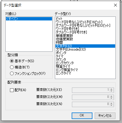 STをやるなら、変数の型(データタイプ)の意識が必須になります。 GX Works3なら、以下のようにリストから選ぶだけなので難しくありません。実数を扱うなら「単精度実数」、文字なら「文字列」を選びましょう。