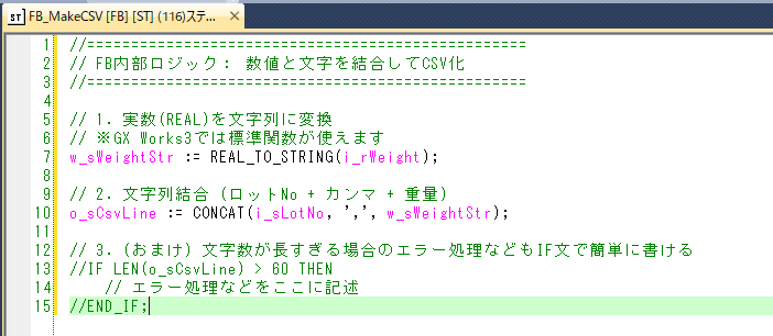 たった1行です。 「文字列操作」「複雑な数式」「IF文による条件分岐」。これらをラダーで書くのは、スプーンで穴を掘るようなものです。ショベルカー(ST)を使ったほうが圧倒的に早いのです。