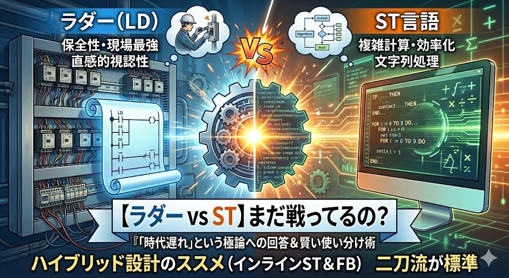 FA業界の休憩所やSNSでは、今日も「ラダー(LD) vs ST言語」の終わらない宗教戦争が繰り広げられています。