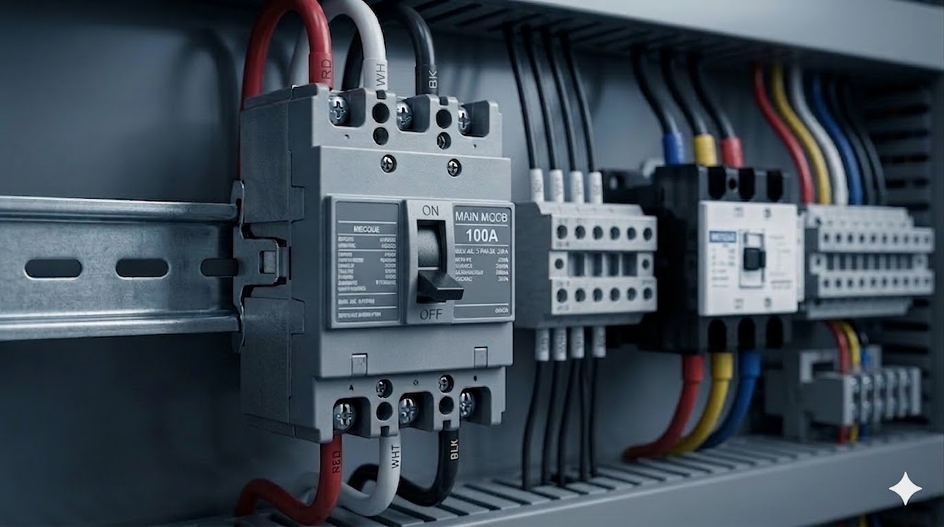 制御盤の主幹に設置された大容量ブレーカー(MCCB:配線用遮断器)のクローズアップ写真