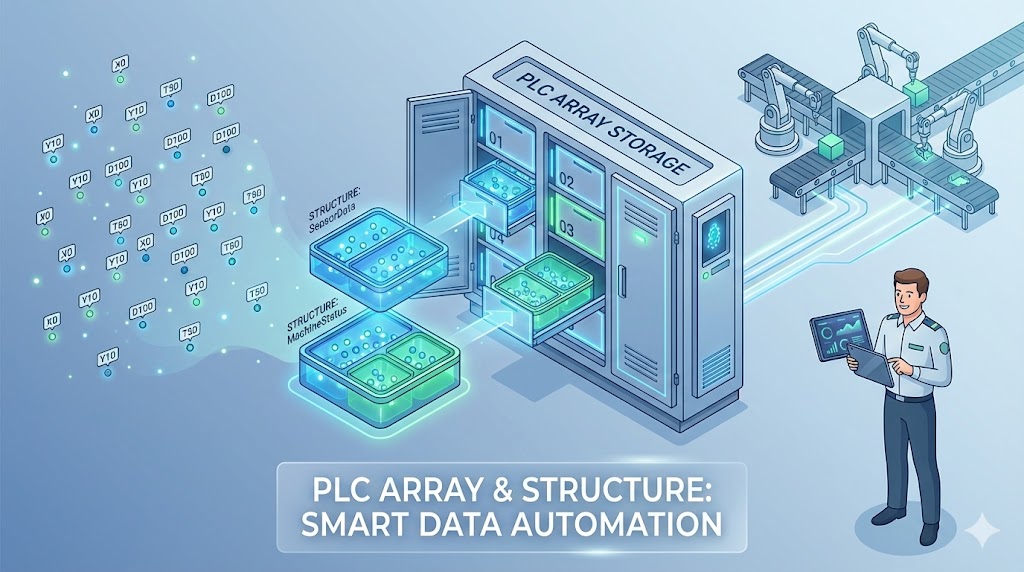 ![PLCの配列(Array)を説明するための概念図。同じ形をしたデータボックスが、番号(インデックス)が振られたロッカーのように一列に整然と並んでいる様子。「Cyl[1]」「Cyl[2]」と順番にアクセスでき、変数[i]で指定できることを示している。](https://yada-blog.com/wp-content/uploads/plc-array-locker-concept.jpg)
