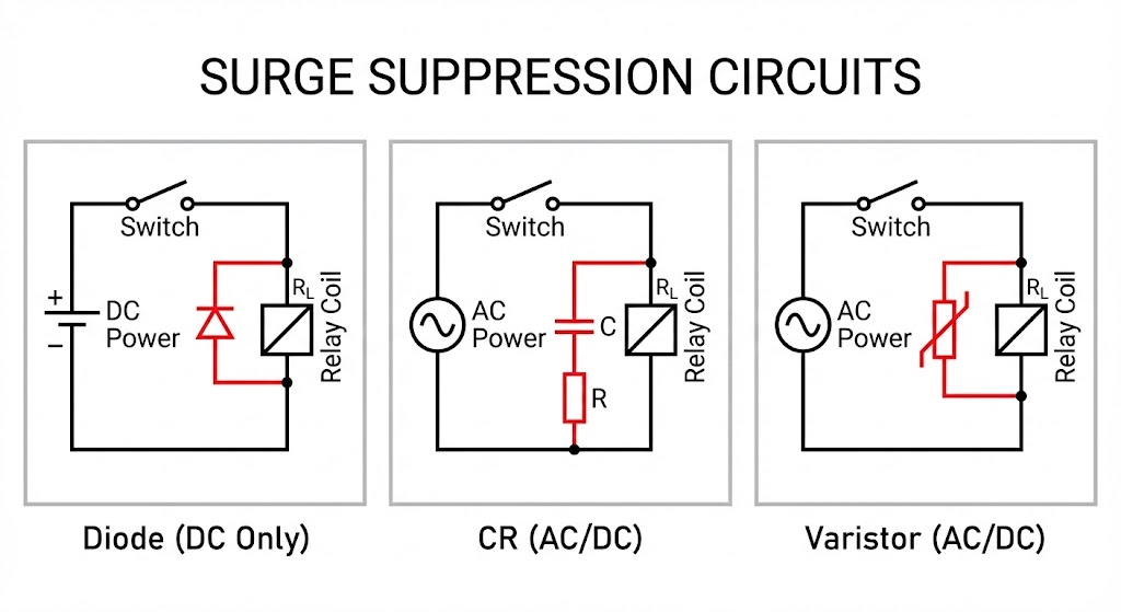 - ◎ ベスト: 「サージキラー内蔵型」のリレーや、「サージキラー付きDINコネクタ」(ソレノイド用)を使う。