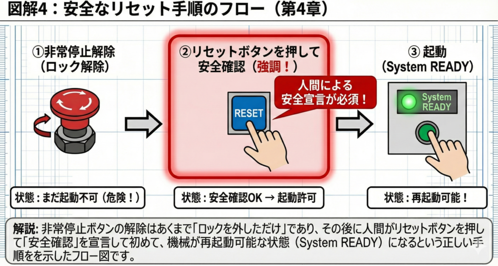 - 非常停止の解除: 「物理的にロックを外しただけ(まだ動かない)」