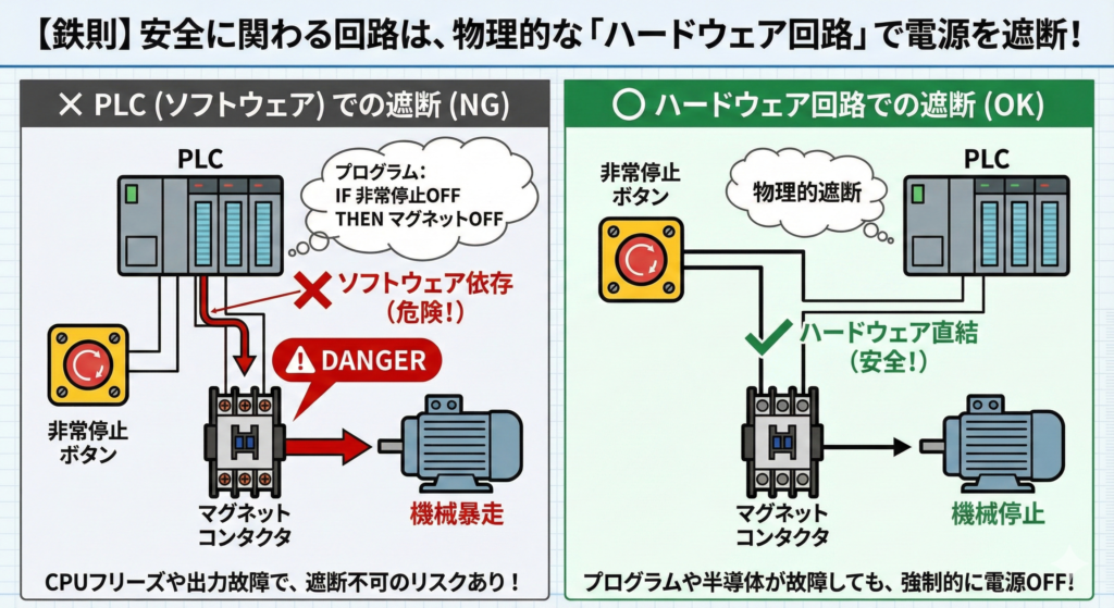 【鉄則】 安全に関わる回路は、プログラム(ソフトウェア)や半導体を介さず、物理的な「ハードウェア回路」で電源を遮断しなければなりません。