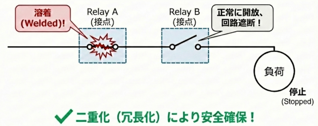 そこで、安全回路では必ず「2個のリレー(マグネット)を直列」に並べます。これを「冗長化(二重化)」と呼びます。
