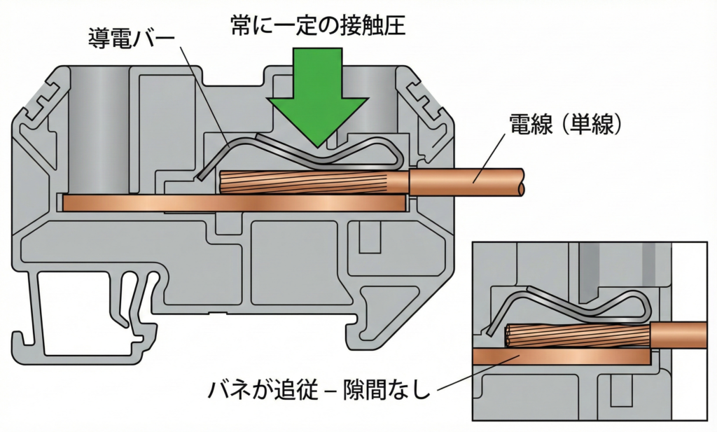スプリング式の最大の特徴は、金属バネの弾性(元に戻ろうとする力)を利用して電線を押さえ続ける点です。