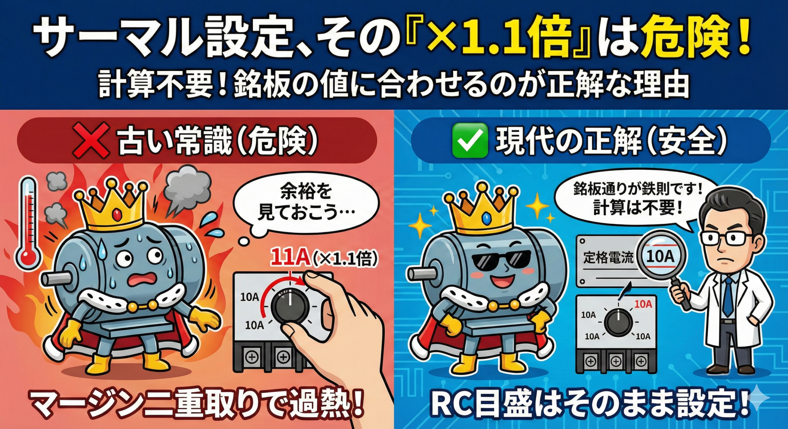 - 例: 定格10Aのモーターに対し、人間が「11A(1.1倍)」に設定。