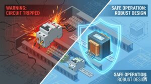 - 一次側(入力側): トランスそのものを動かすための回路です。 電源を入れた瞬間に巨大な「突入電流」が流れるという特殊な性質があるため、「異常ではない一瞬の大電流で、ブレーカーが勝手に落ちないようにする(不要トリップの回避)」ことが求められます。